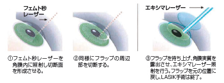 通常、LASIKは、眼科用のケラトーム(鉋)でフラップ(蓋)を作製し、その下の実質をエキシマレーザーで削り、フラップを戻す、という手順で行います。