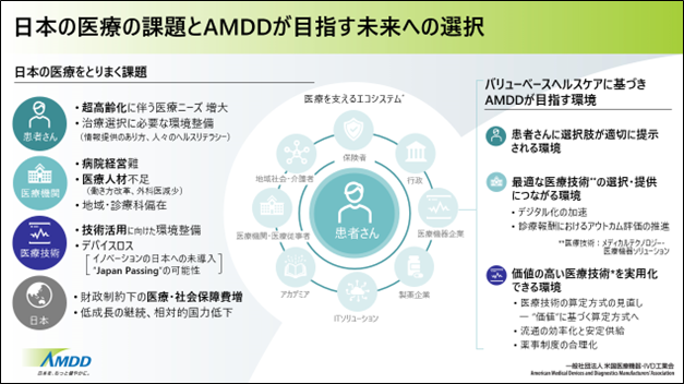 世界でも類を見ない速さで高齢化が進む日本において、医療をめぐる課題は一層複雑化しています。こうした課題に対し、メドテック・イノベーションが果たす役割は、日本の患者さんの価値向上につながるだけでなく、日本発の知見として世界が注目しています。AMDDは、バリューベース・ヘルスケアの実現を通じて、価値あるイノベーションを医療現場に届け、患者さんに適切な選択肢を提供することで、質の高い医療と社会保障の持続可能な両立を医療エコシステム全体で目指します。